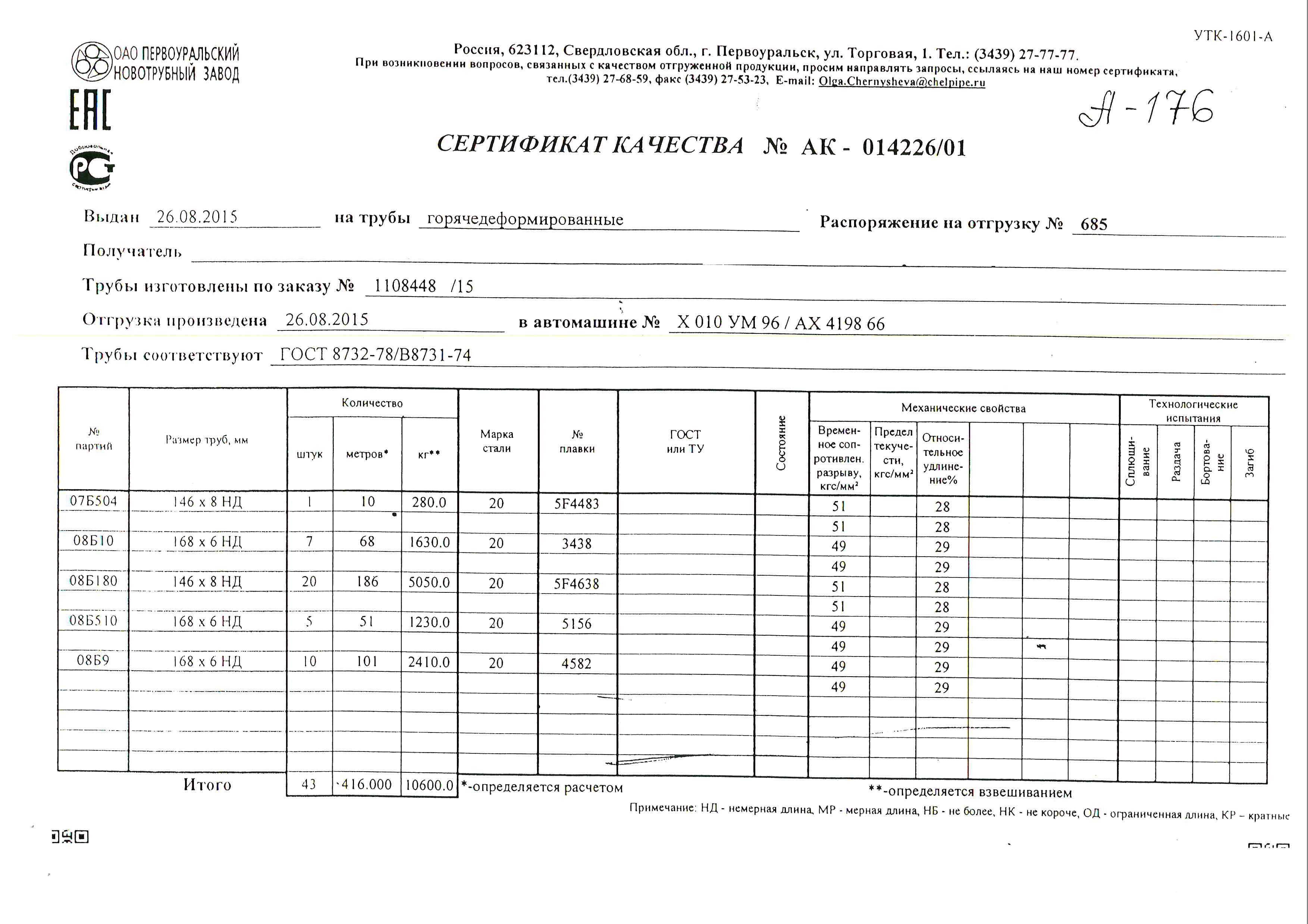 С каждой товарной позицией мы предоставляем все сертификаты и паспорта качества, а также товарно-транспортную накладную.