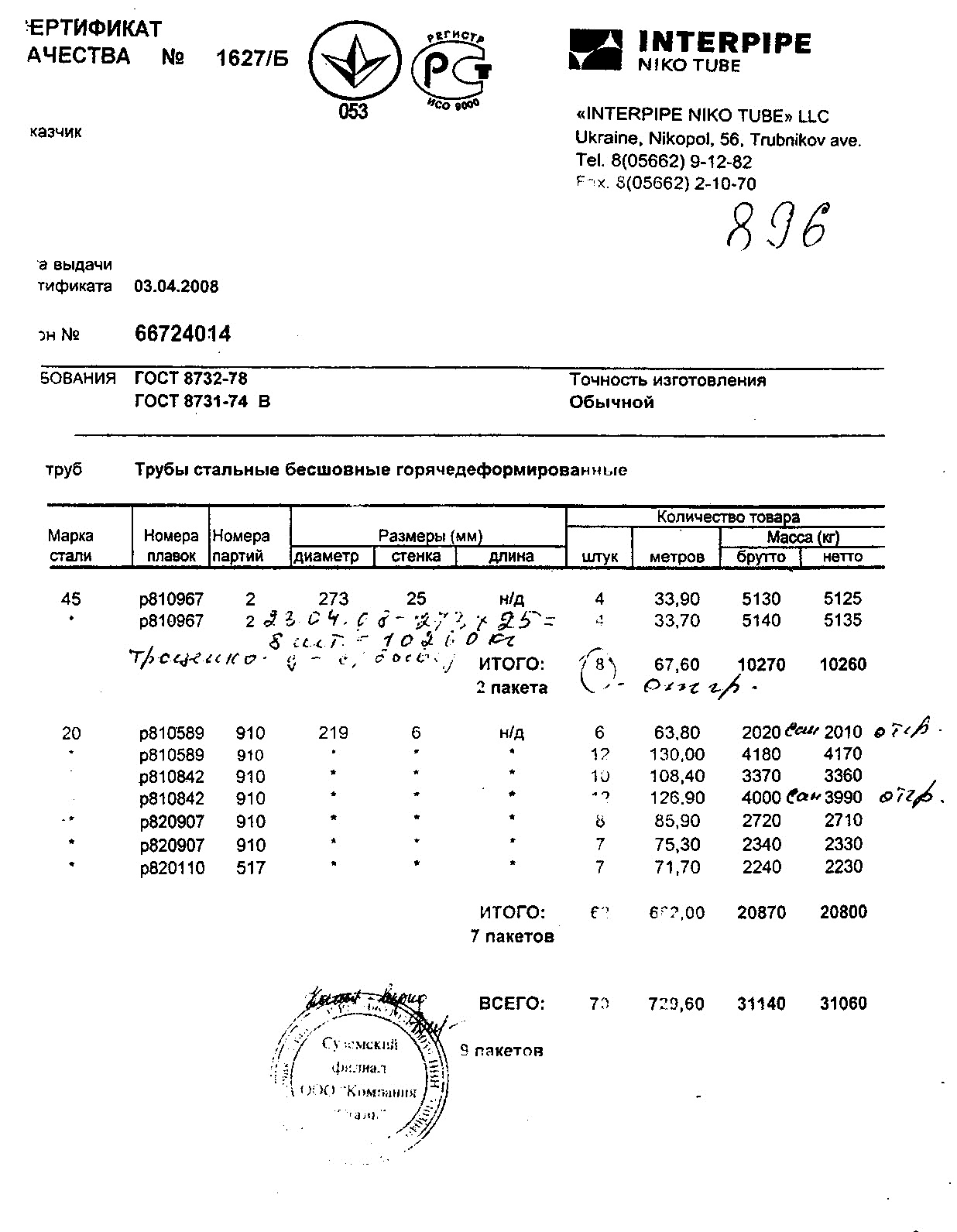 С каждой товарной позицией мы предоставляем все сертификаты и паспорта качества, а также товарно-транспортную накладную.