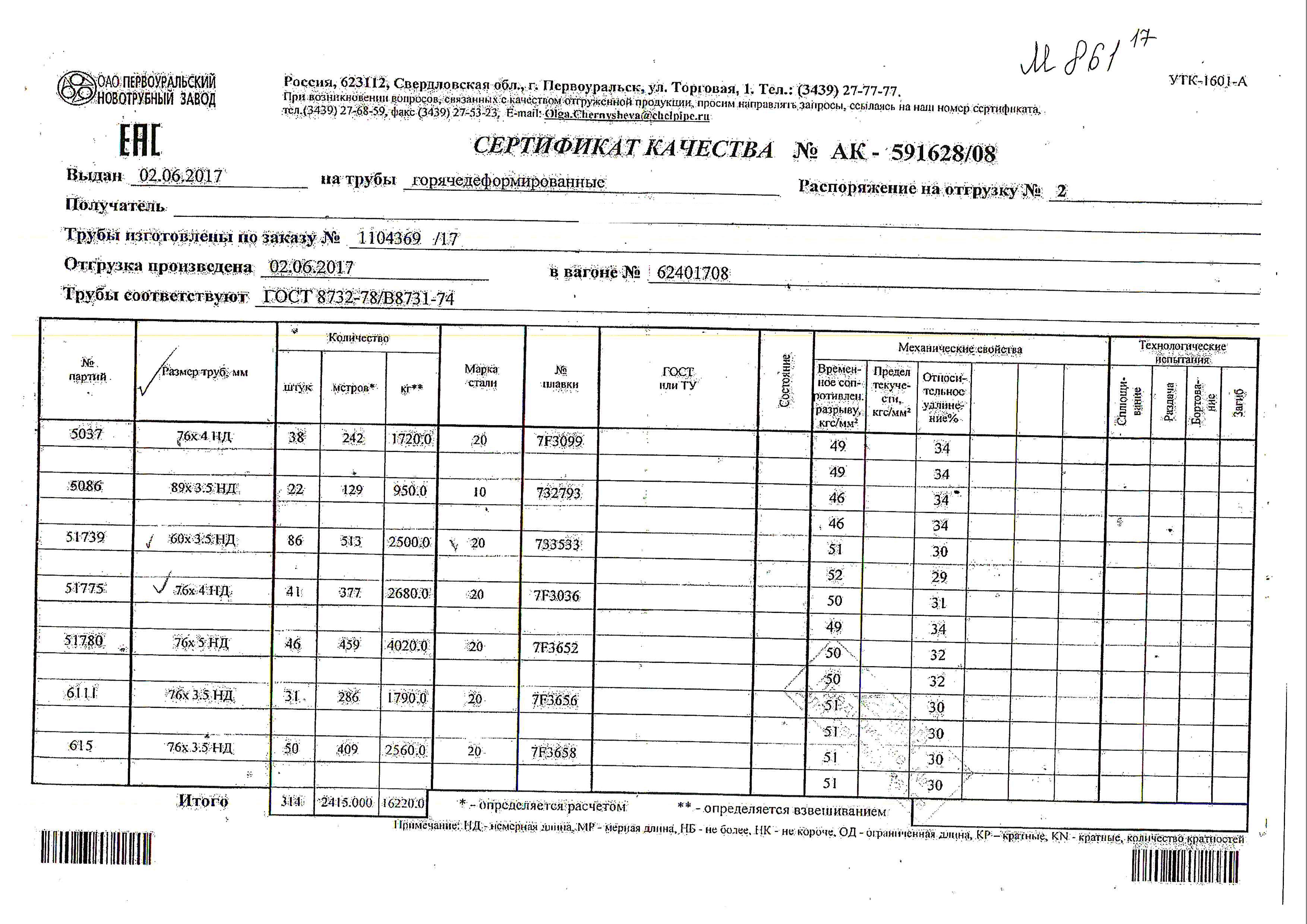 С каждой товарной позицией мы предоставляем все сертификаты и паспорта качества, а также товарно-транспортную накладную.