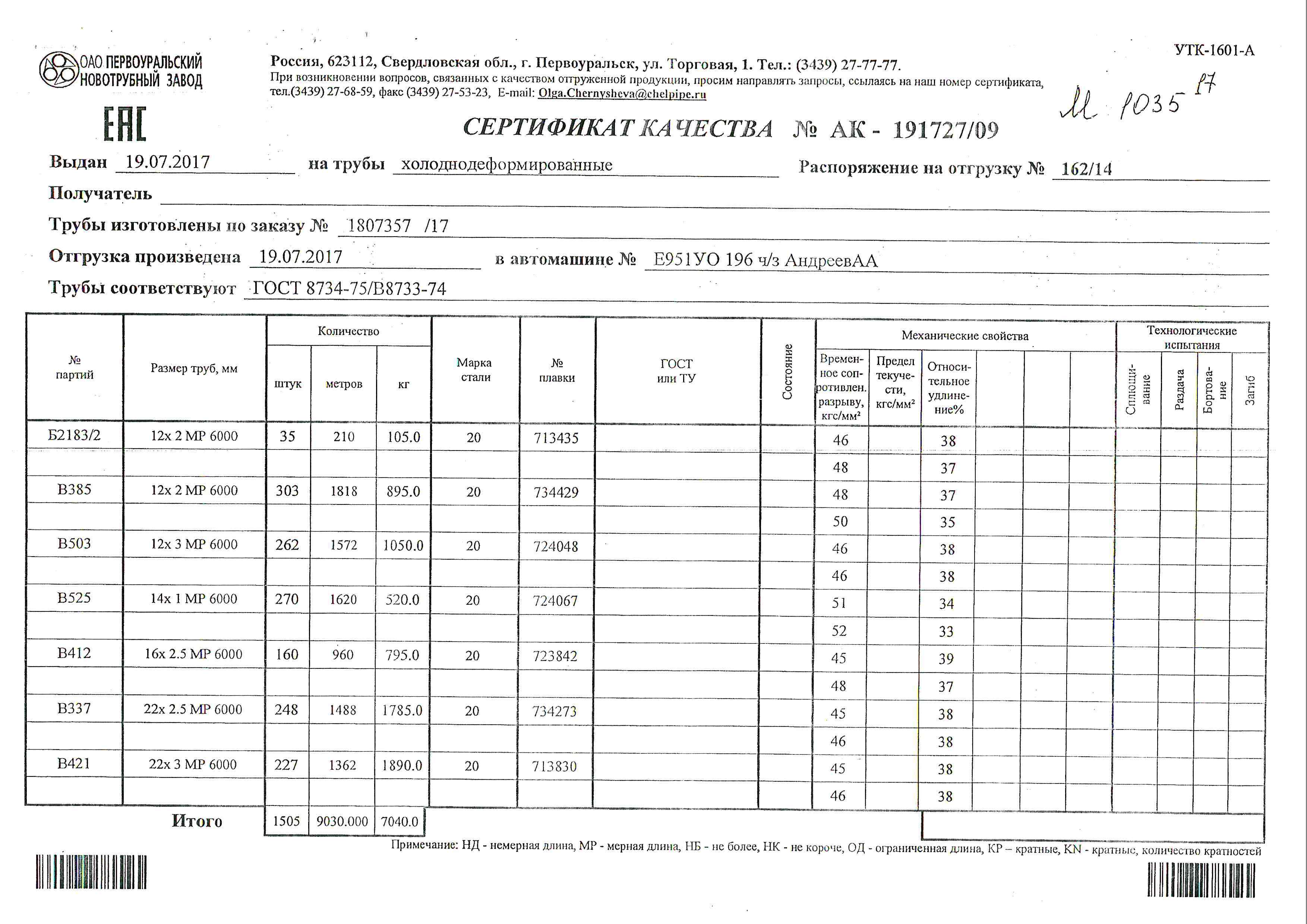 С каждой товарной позицией мы предоставляем все сертификаты и паспорта качества, а также товарно-транспортную накладную.