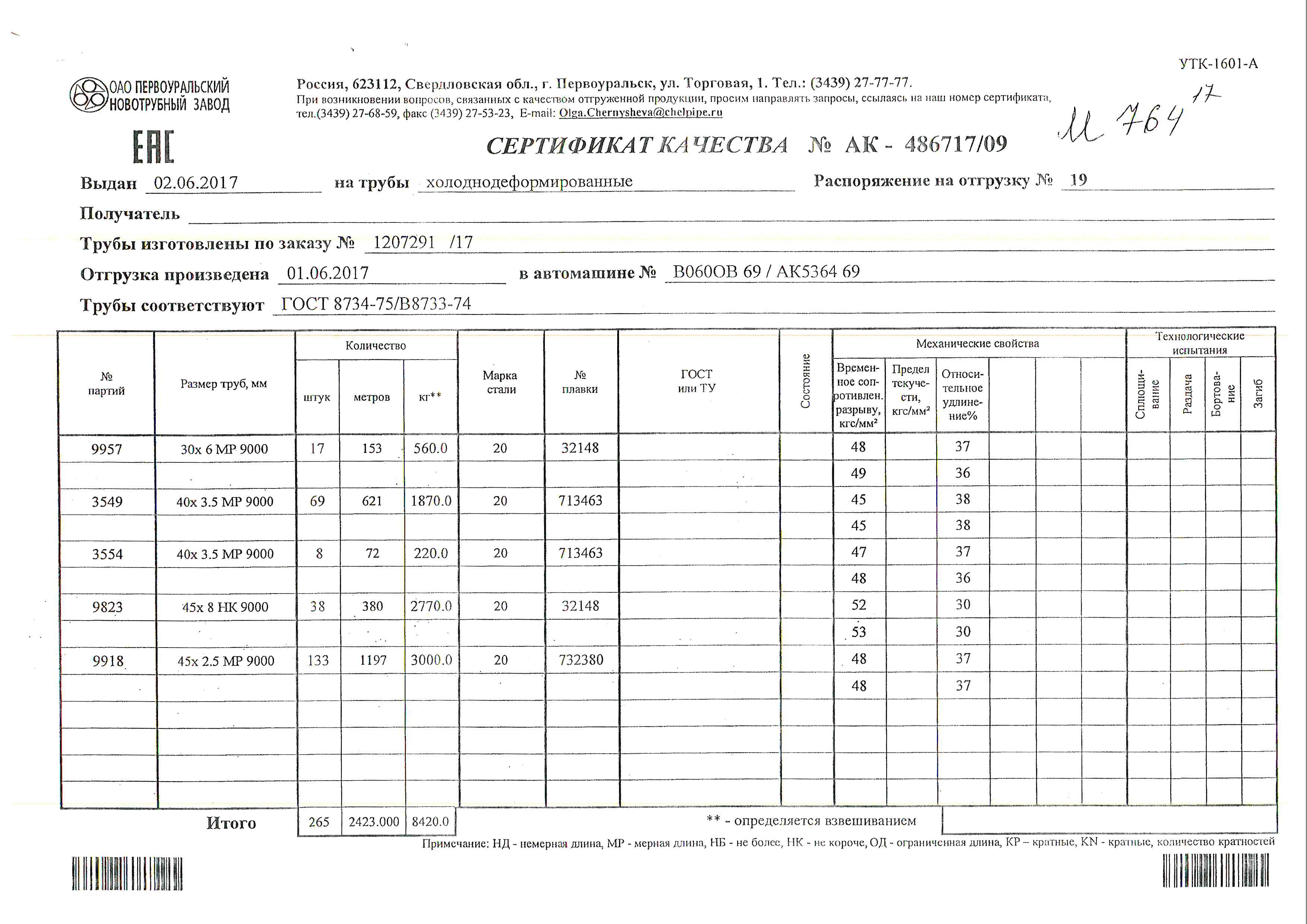 С каждой товарной позицией мы предоставляем все сертификаты и паспорта качества, а также товарно-транспортную накладную.
