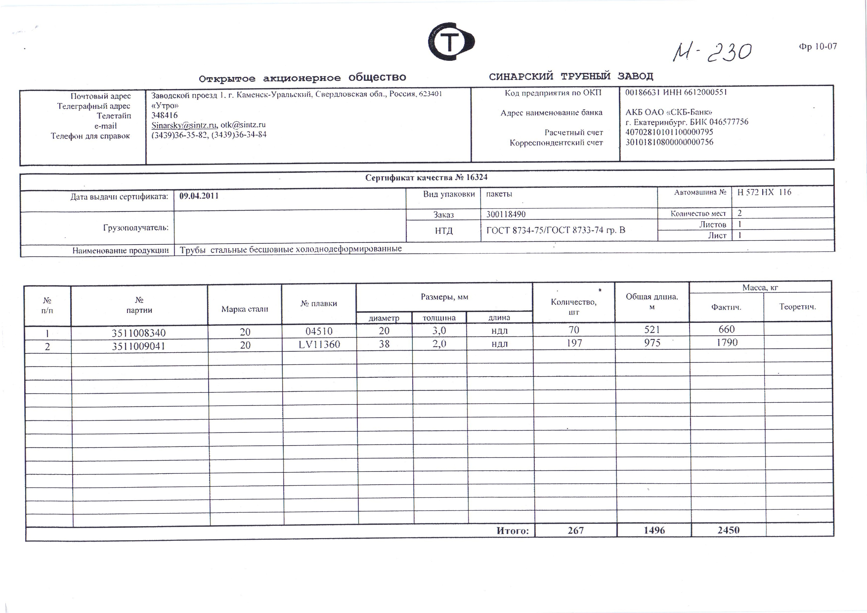 С каждой товарной позицией мы предоставляем все сертификаты и паспорта качества, а также товарно-транспортную накладную.