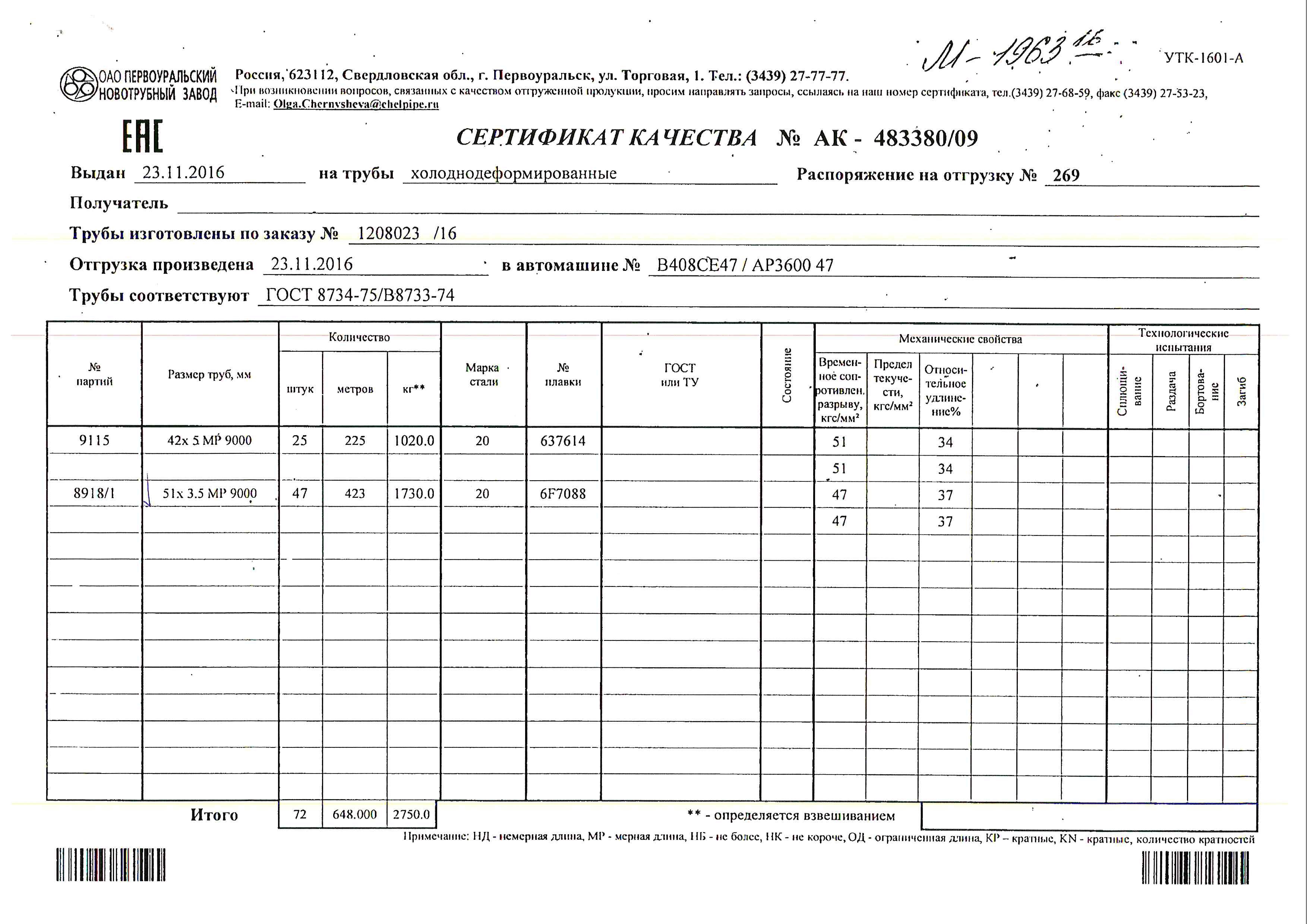 С каждой товарной позицией мы предоставляем все сертификаты и паспорта качества, а также товарно-транспортную накладную.