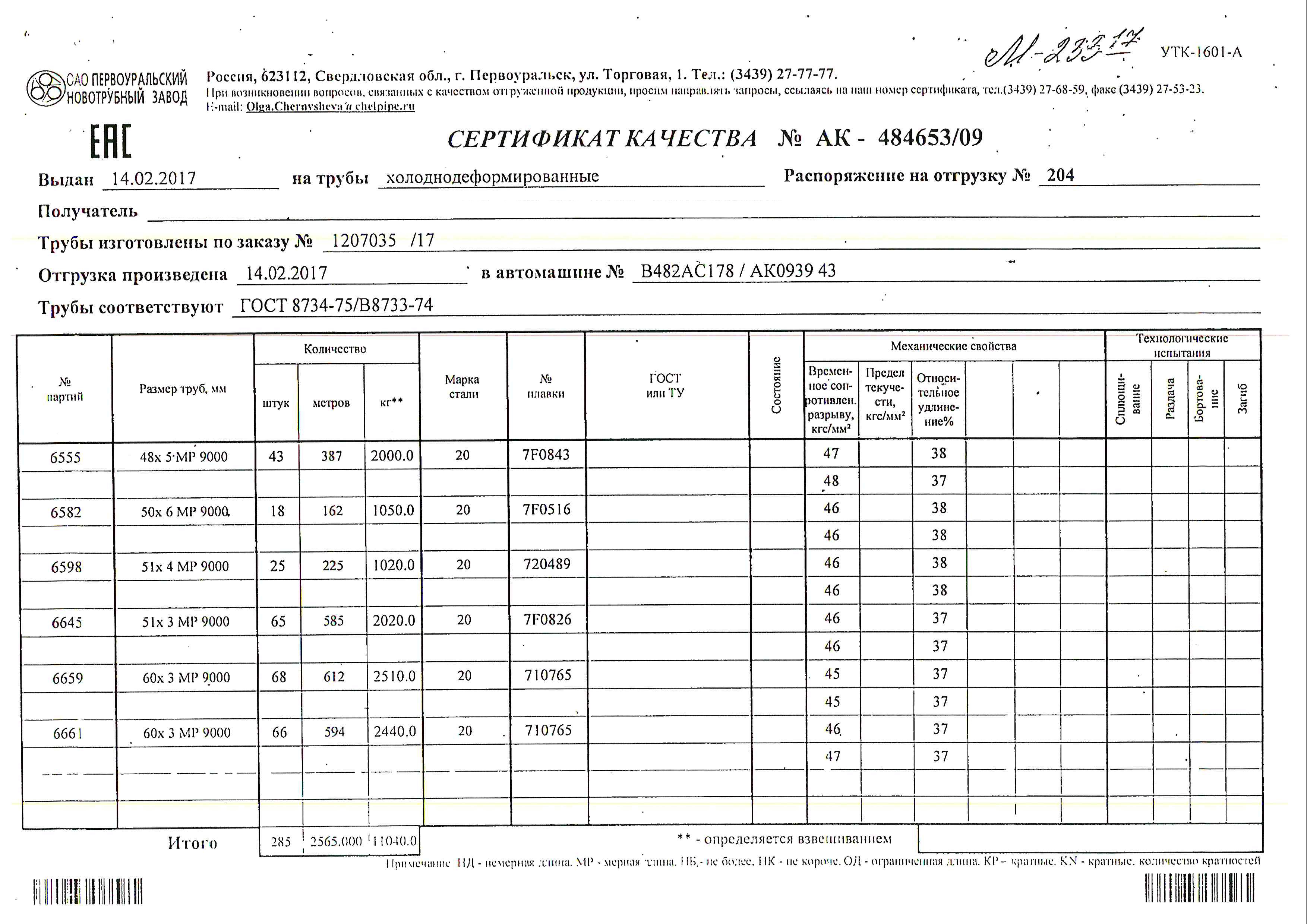 С каждой товарной позицией мы предоставляем все сертификаты и паспорта качества, а также товарно-транспортную накладную.
