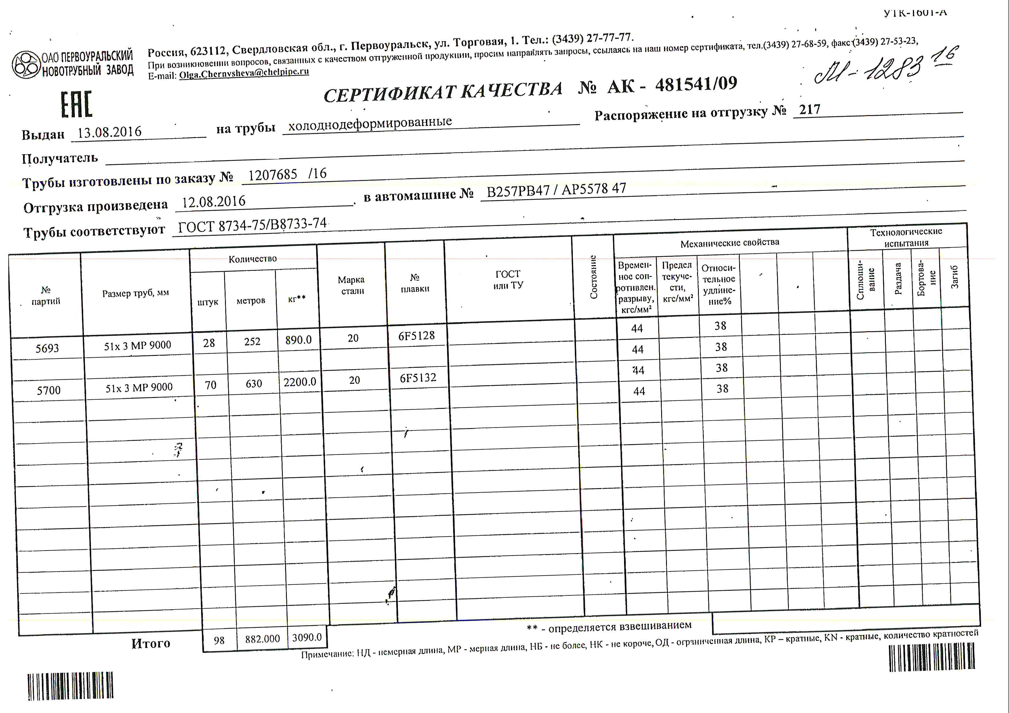 С каждой товарной позицией мы предоставляем все сертификаты и паспорта качества, а также товарно-транспортную накладную.